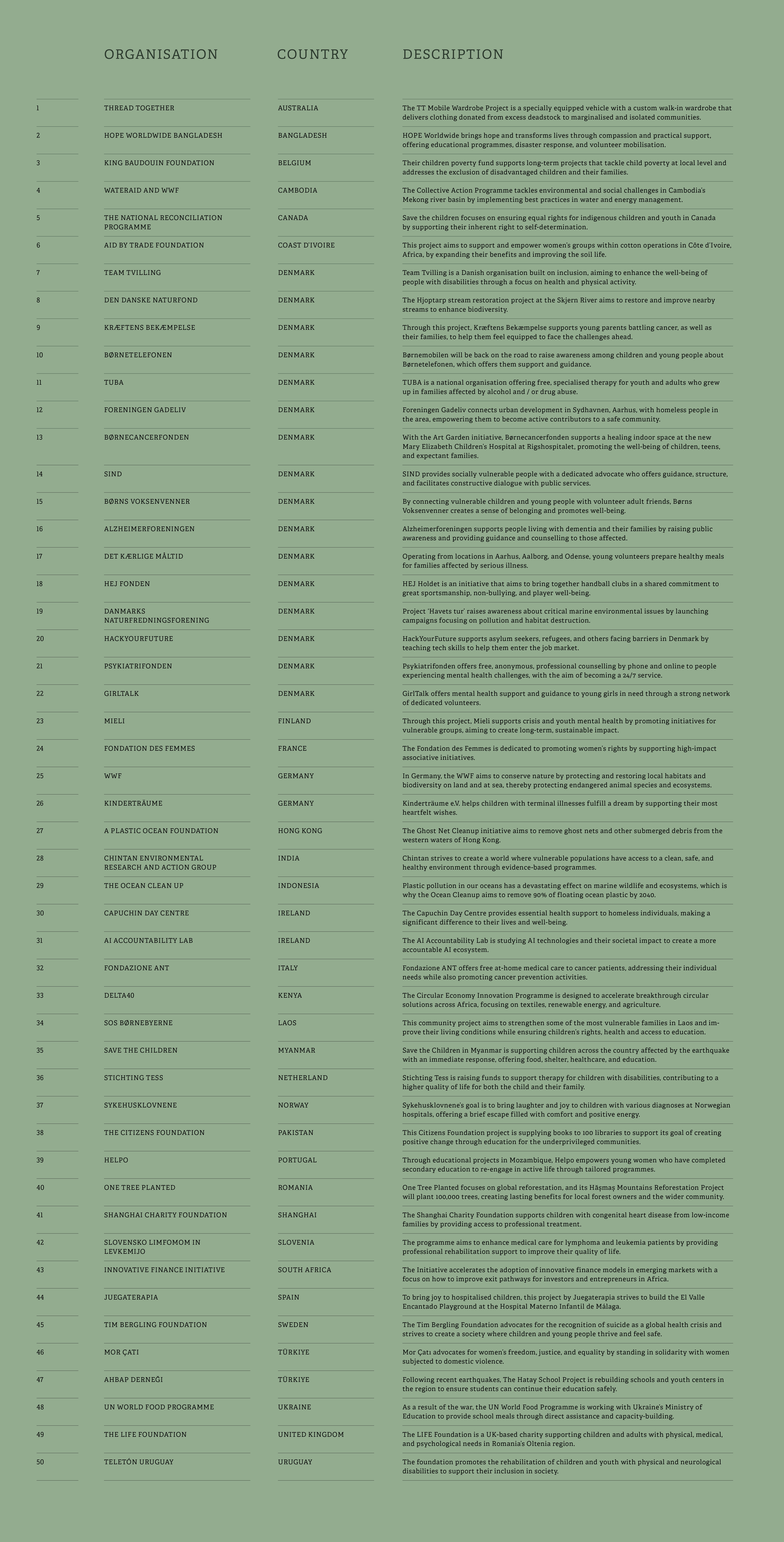 All the 50 selected organisations are active in either a BESTSELLER community in Denmark or abroad, or in sub-Saharan Africa, which is a key focus area for the foundation. Through ongoing activities, the organisations support either a vulnerable group in society or a relevant environmental cause.